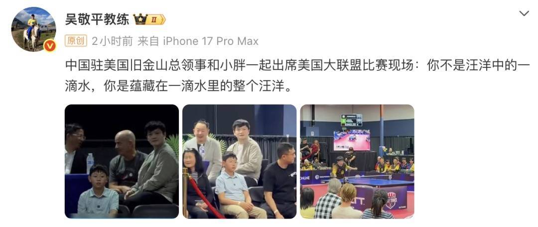 樊振东的恩师吴敬平全国炒股配资教练发文:“中国驻美国旧金山总领事和樊振东一起出席美国大联盟比赛现场:你不是汪洋中的一滴水,你是蕴藏在一滴水里的整个汪洋。”