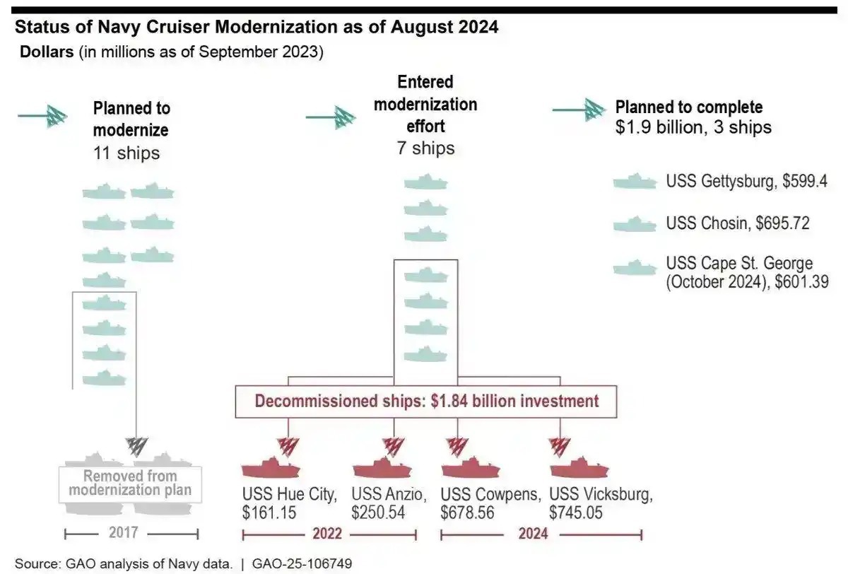 的确,这种事在美国已经不是第一次发生了,2024年,美国政府问责办公室发布了一则消息:美国海军花了37亿美元升级7艘提康德罗加级巡洋舰,结果其中4艘升级到一半就退役了,剩下3艘也无法在规定时间内服役。而这37亿美元如果拿来采购新型舰艇,足够为美国海军买2艘伯克级驱逐舰。可钱就这么打水漂了,依然无人被问责,美国海军依然是花了钱却没得到自己想要的东西。